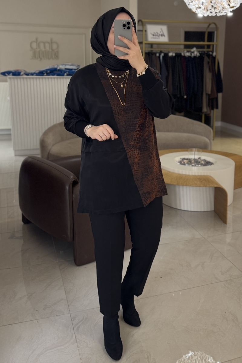 Kahverengi Süet Ve Merserize Detaylı 3004 Tunik