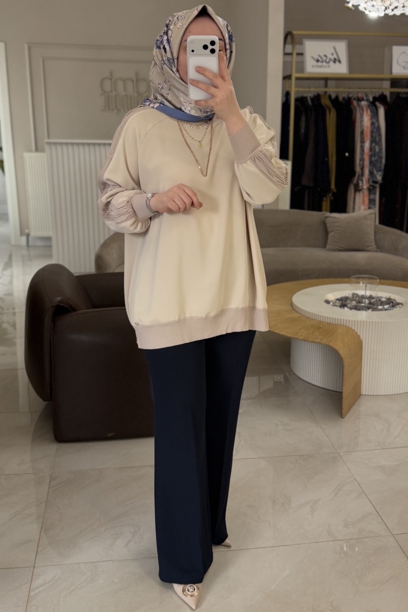 Bej Kolu Nervürlü Tunik