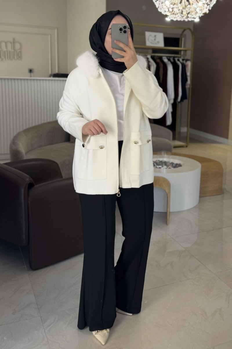Beyaz YAKASI KÜRKLÜ TRİKO HIRKA