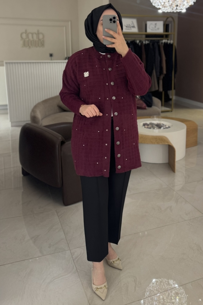 Nuss Bordo Angora Şerit Taş Detay Hırka 7010