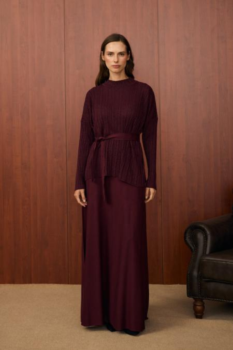 Bordo Kraş Detaylı Kendinden Desenli Eetekli Takım