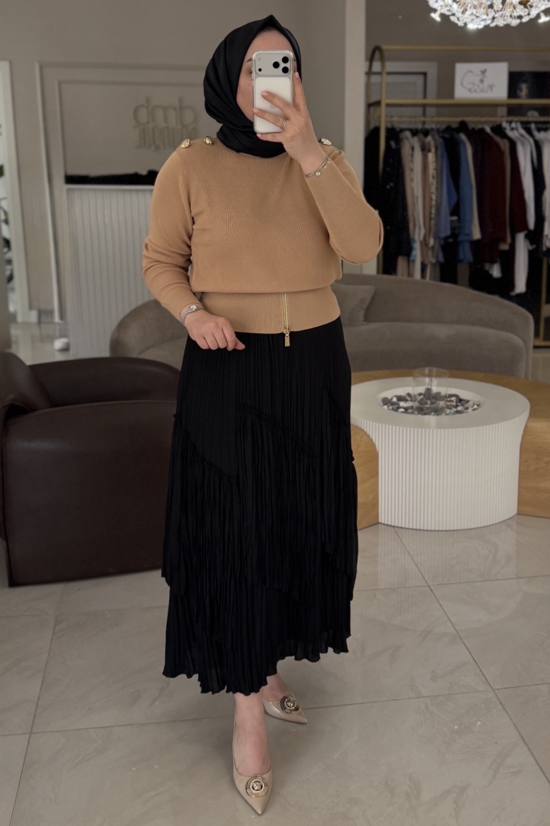 Camel Kolyeli Pilise Detaylı Tunik