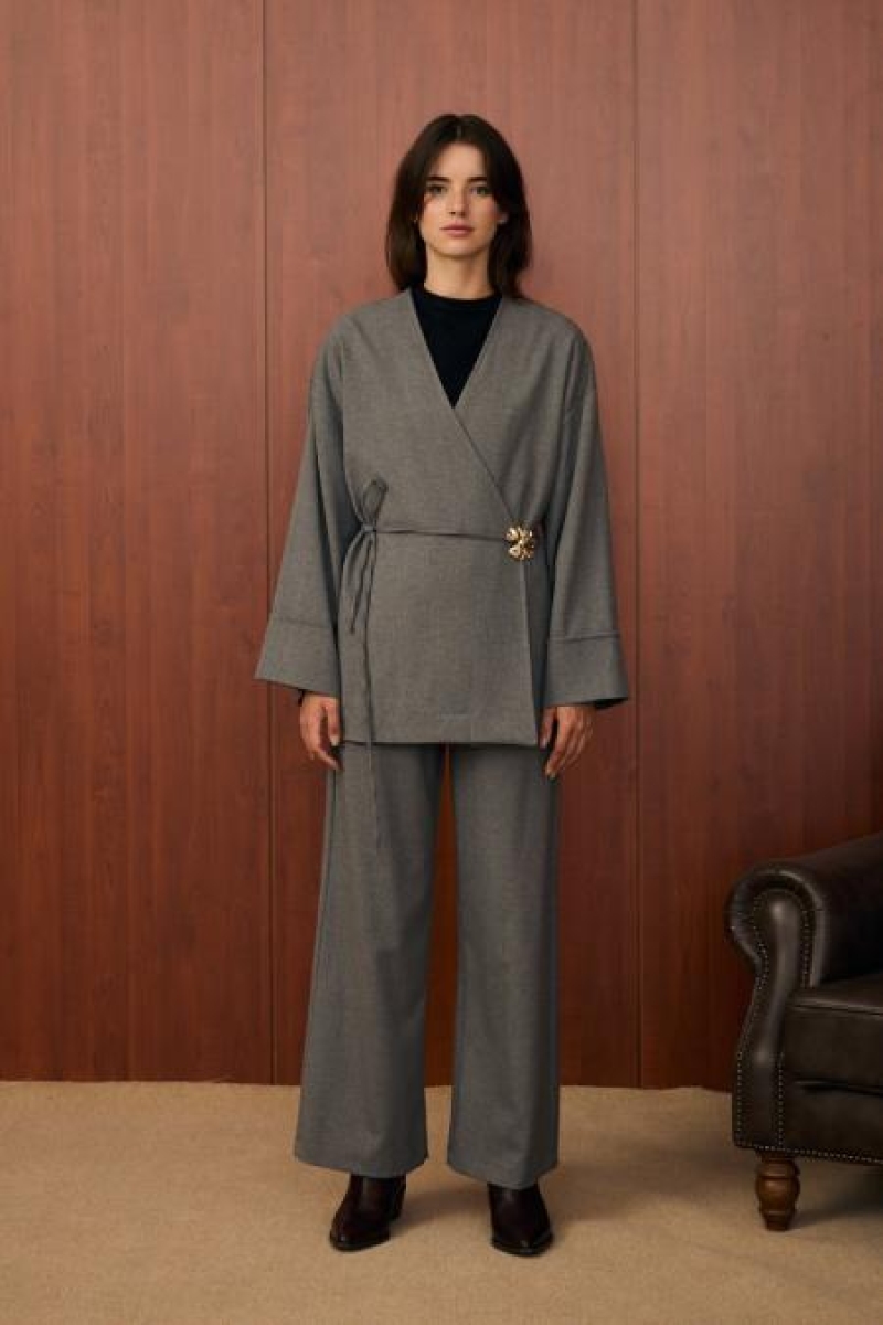 Gri Pile Detaylı Pantolonlu İkili Takım