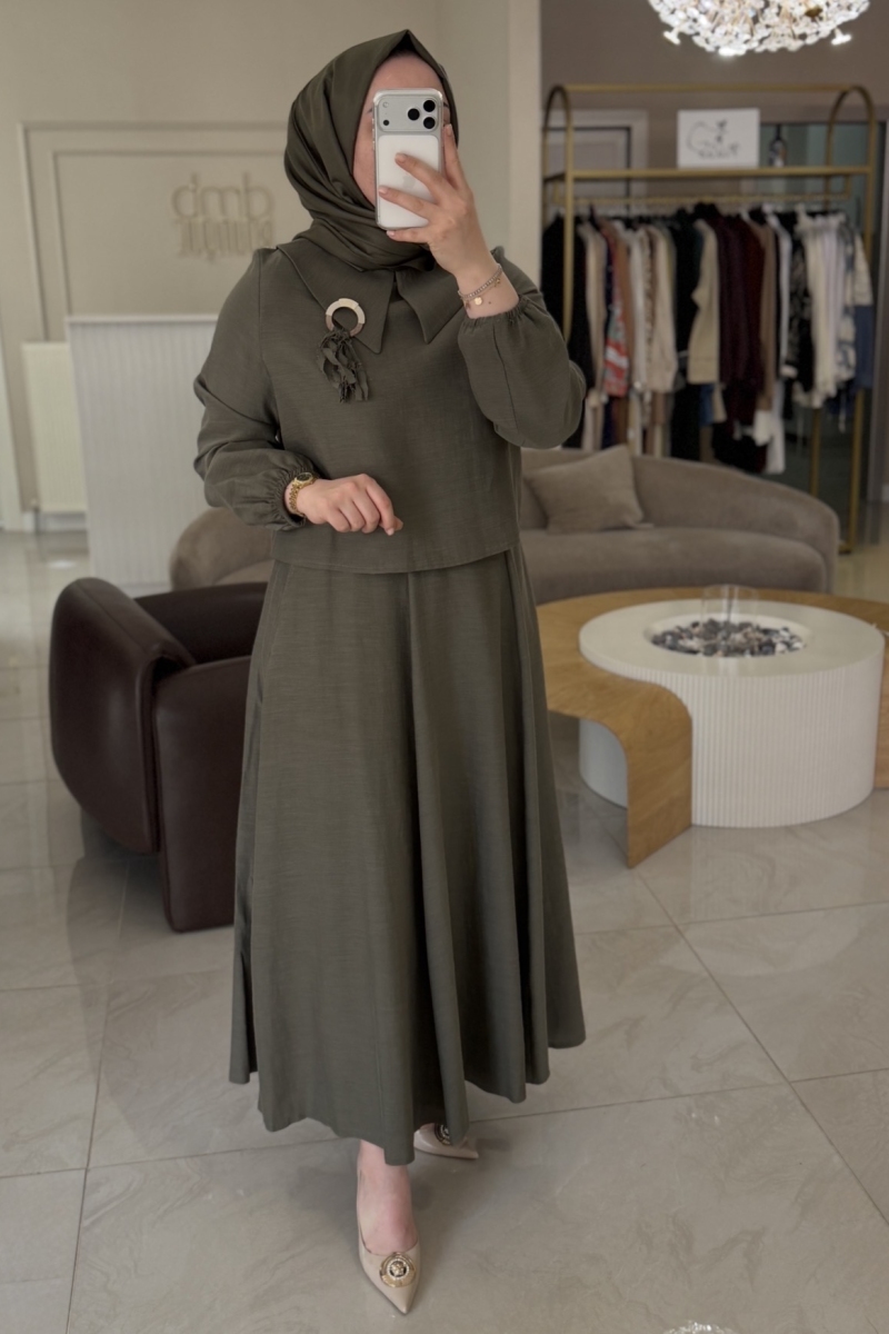Haki Jakar Desenli Büzgü Etekli Takım 1058