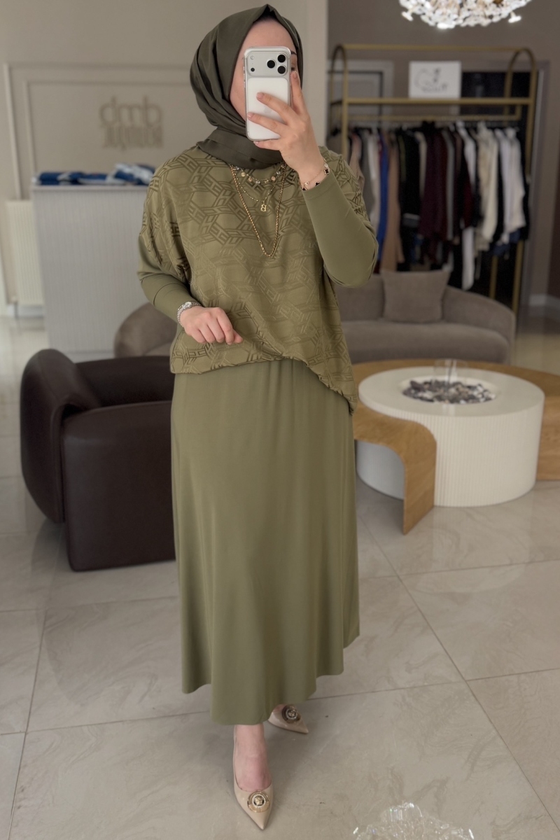 Nuss Haki Jakar Desenli Büzgü Etekli Takım 1058