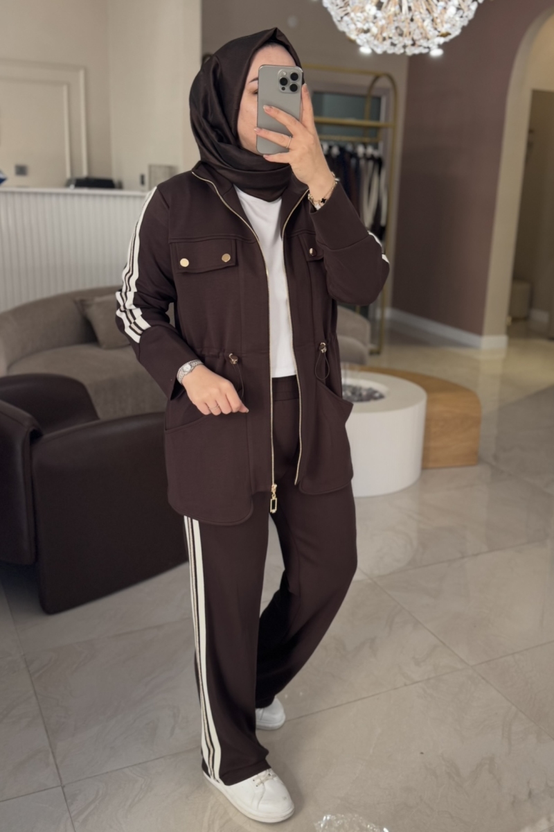 Kahverengi Spor Dikişli Pantolonlu İkili Takım