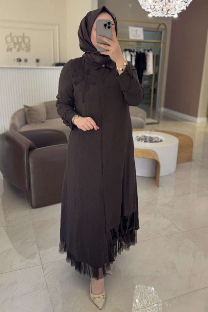 Lıssmore Kahverengi İşlemeli İçliği Fırfır Detaylı Elbise