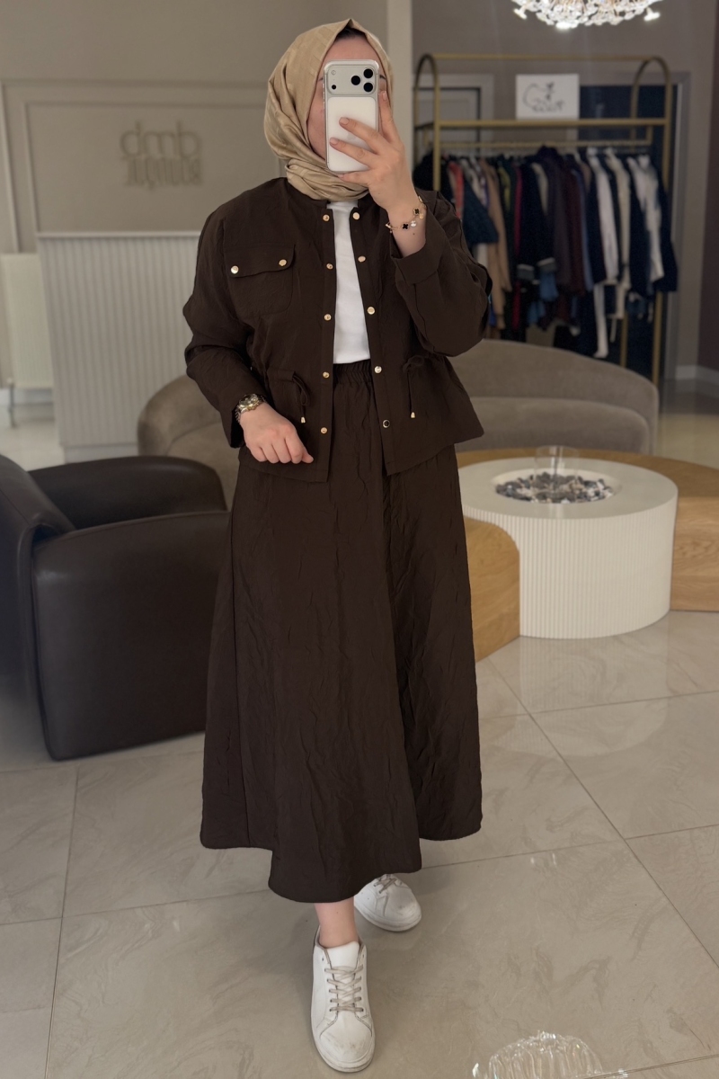 Nuss Kahverengi Kırışık Bel Büzgülü Cep Detay Etekli Takım 1090