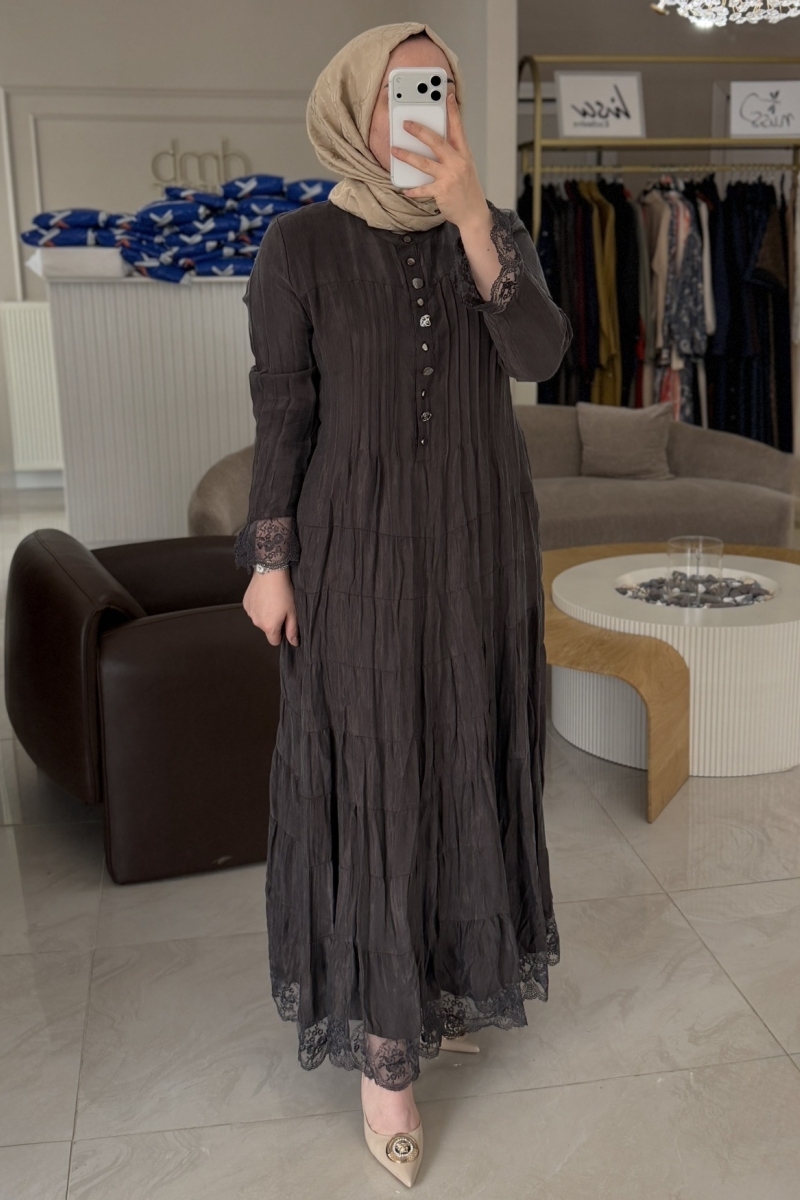 Kahverengi Güpür Detaylı 6148 Elbise