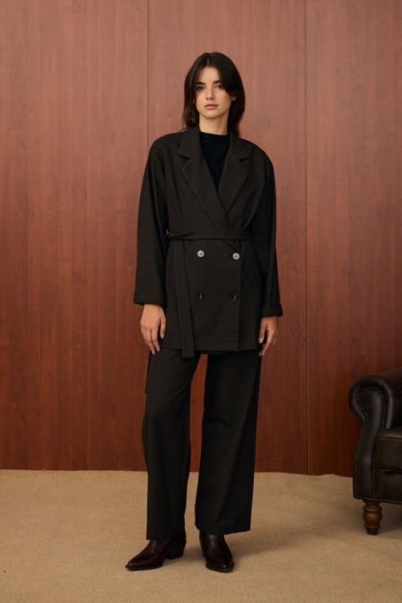 Siyah Pile Detaylı Pantolonlu İkili Takım