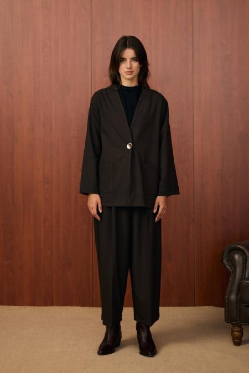 Siyah Pile Detaylı Pantolonlu İkili Takım