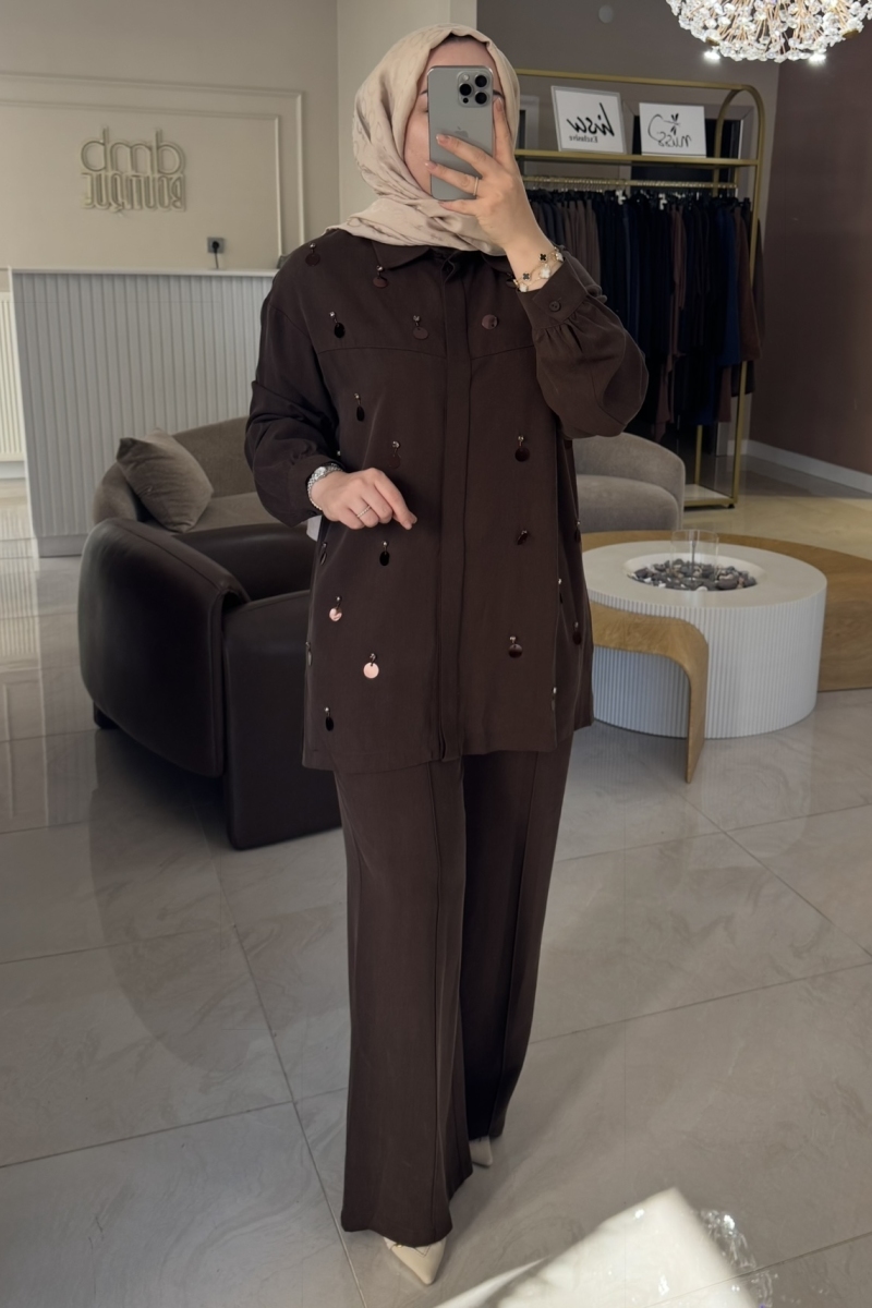 Nuss Kahverengi Pullu Ve Taş İşlemeli Takım 1031