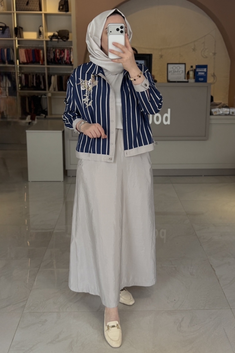 Tıg Trıko Lacivert Boncuk Pul Nakışlı Garnili Gömlek Ve Etek Takım