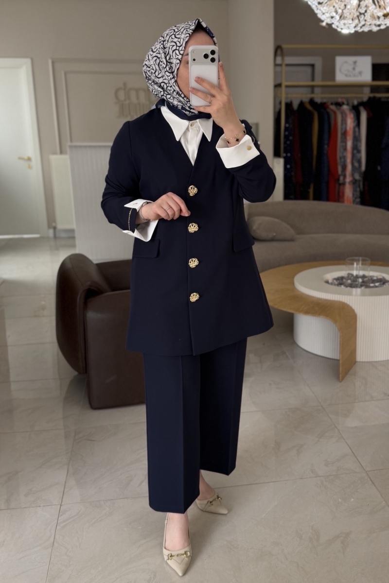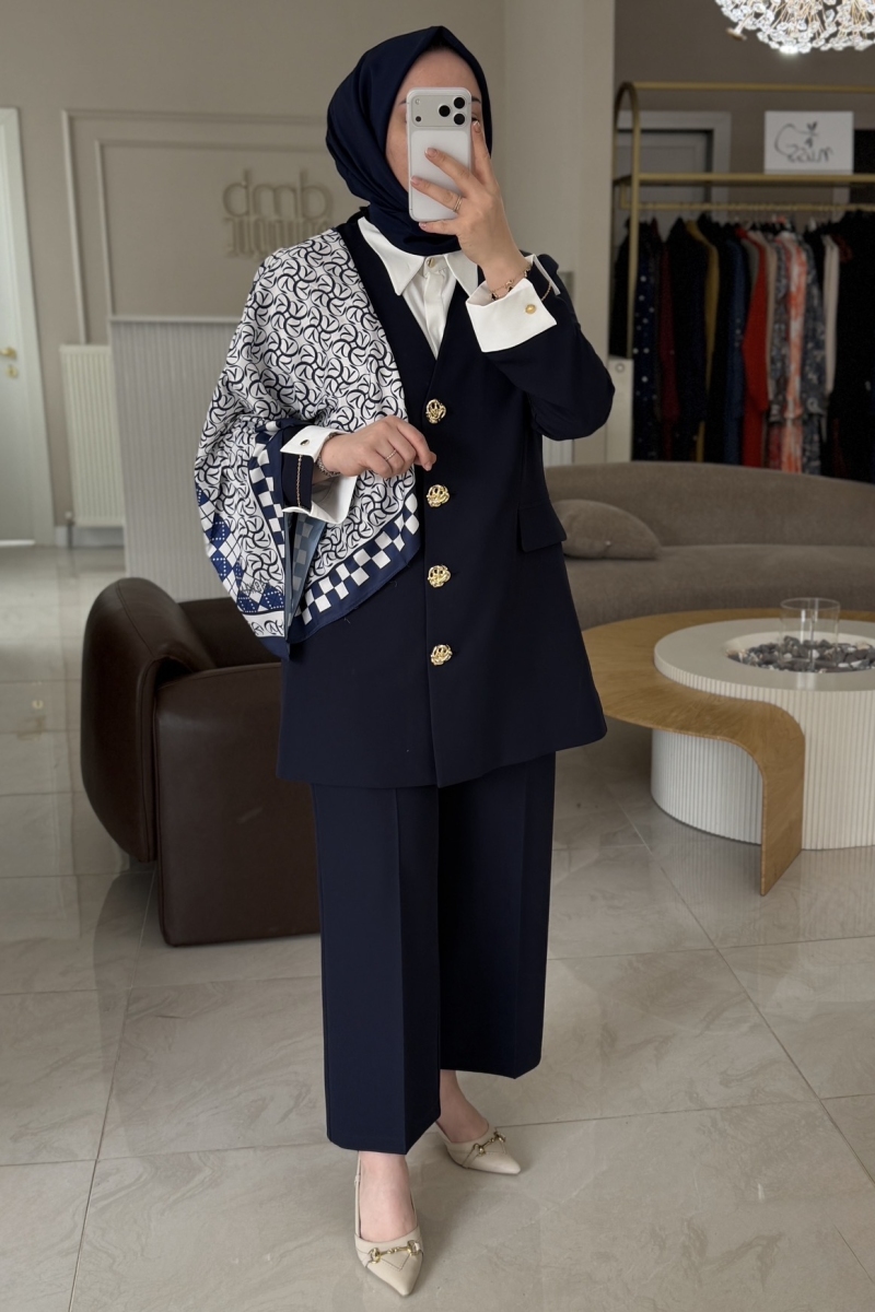 Esswaap Lacivert Eşarplı Kol Düğmeli Takım