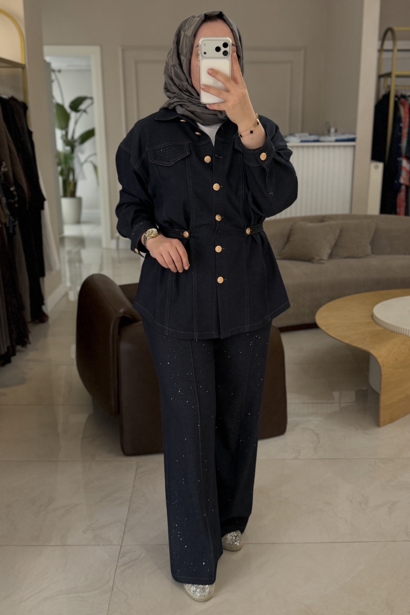 Taş Jakar Detaylı Büzgülü Cep Detaylı 1097 Pantolonlu Takım