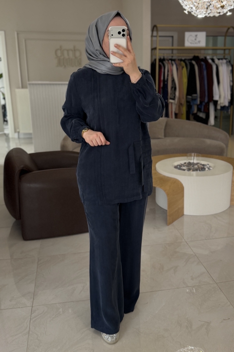 Nuss Lacivert İpek Kupra Pantolonlu Takım 1039