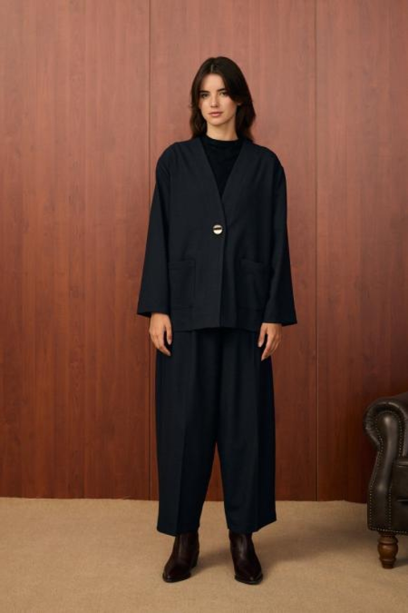 Siyah Pile Detaylı Pantolonlu İkili Takım