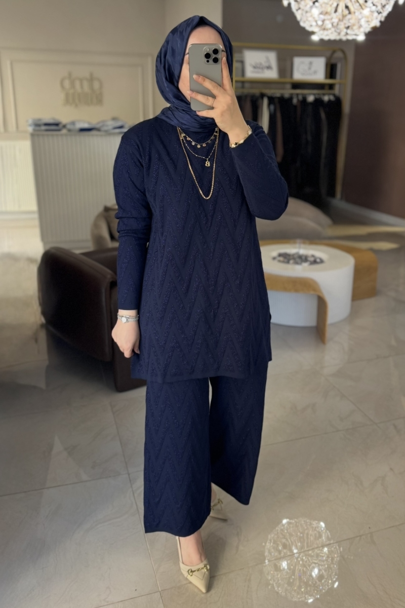 Siyah Pile Detaylı Pantolonlu İkili Takım