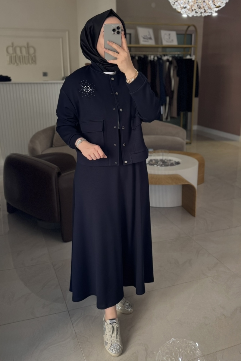Nuss Lacivert Taş İşlemeli Çıt Ceketli Etekli Takım