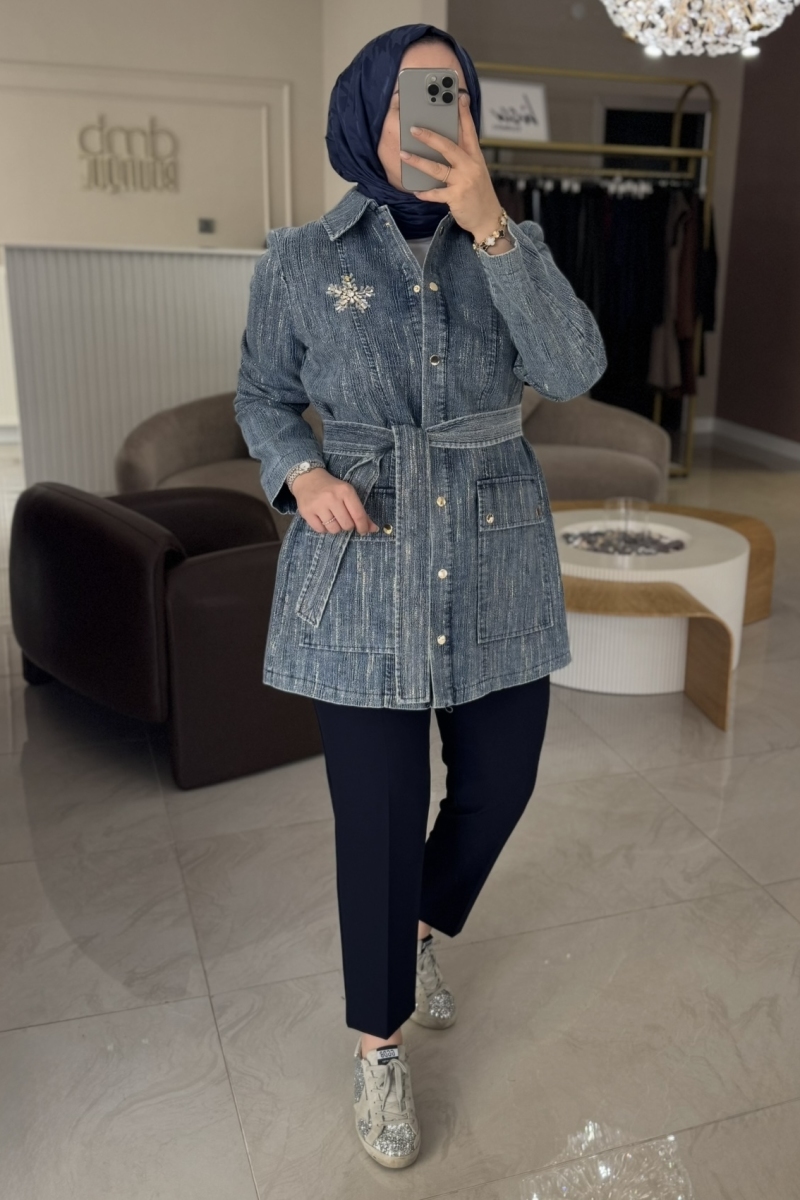 Nuss Mavi Jakar Detaylı Denim Ceket