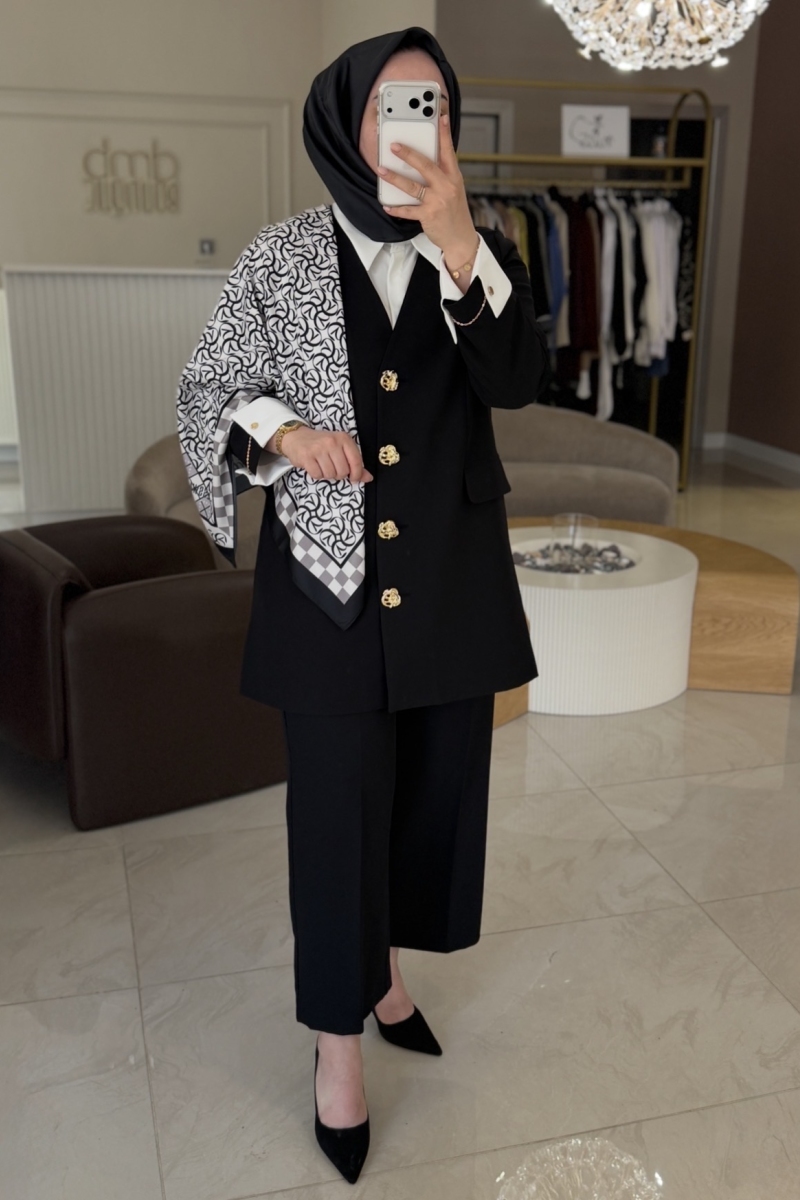 Esswaap Siyah Eşarplı Kol Düğmeli Takım