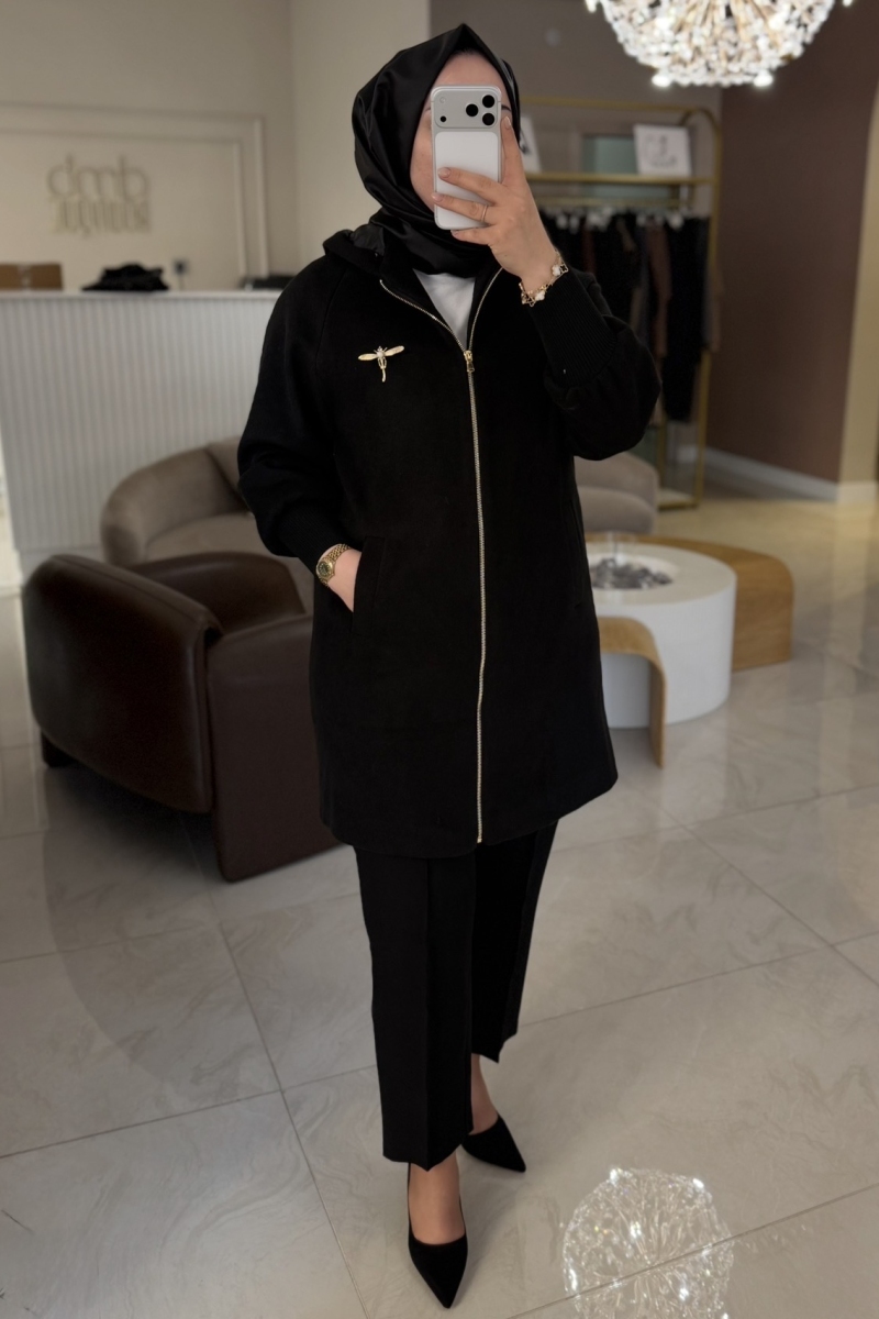 Esswaap Siyah Fermuarlı Kapüşonlu Kaban