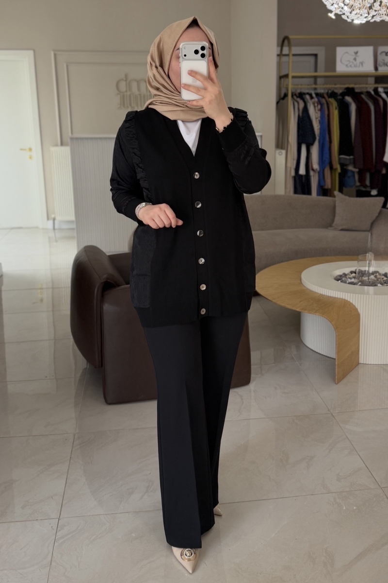 Tıg Trıko Siyah Fırfır Detaylı Jakar Kumaş Mixli Triko Hırka