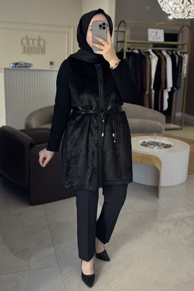 Esswaap Siyah Gümüş Detaylı Kürk Yelek