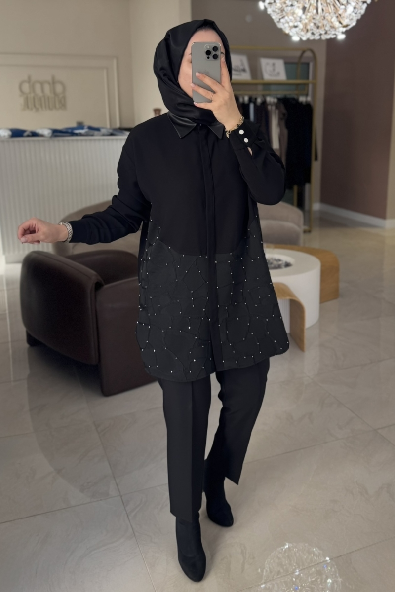 Esswaap Siyah Jakar Garnili Taş İşli Tunik