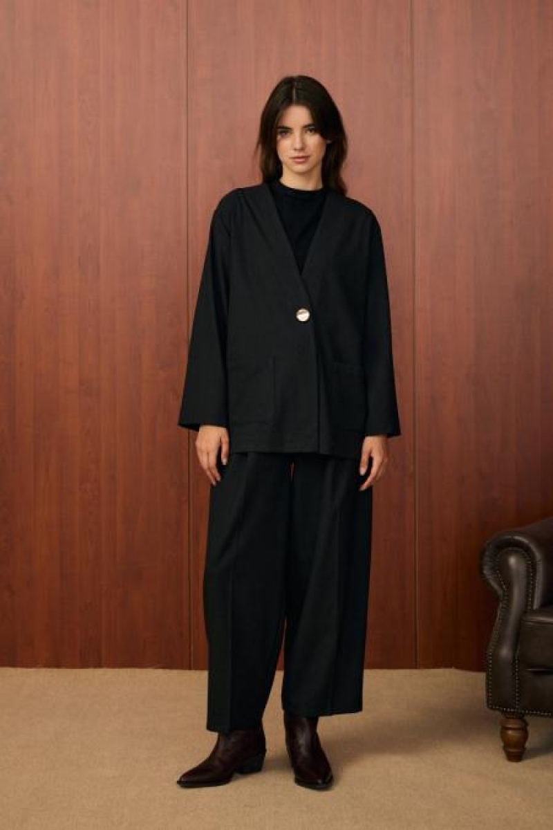 Siyah Pile Detaylı Pantolonlu İkili Takım