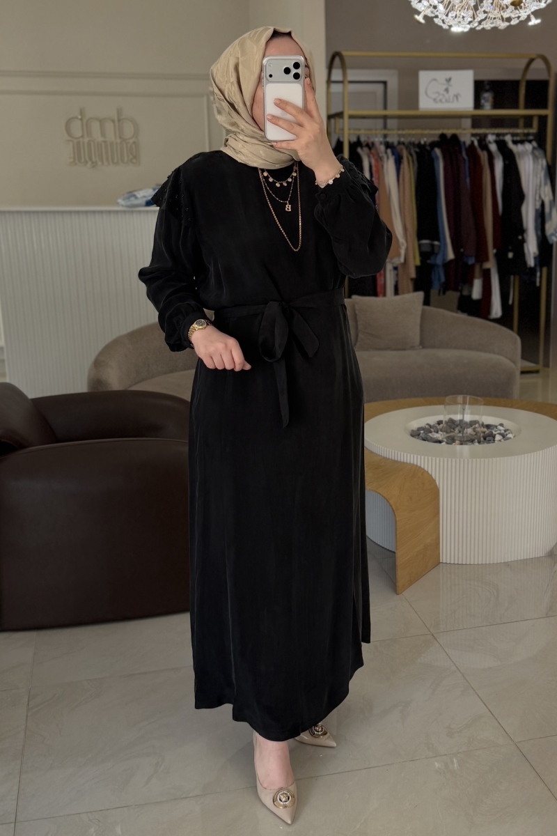 Nuss Siyah Omuz Fırfırlı Ve Taşlı Kupra Elbise 2043