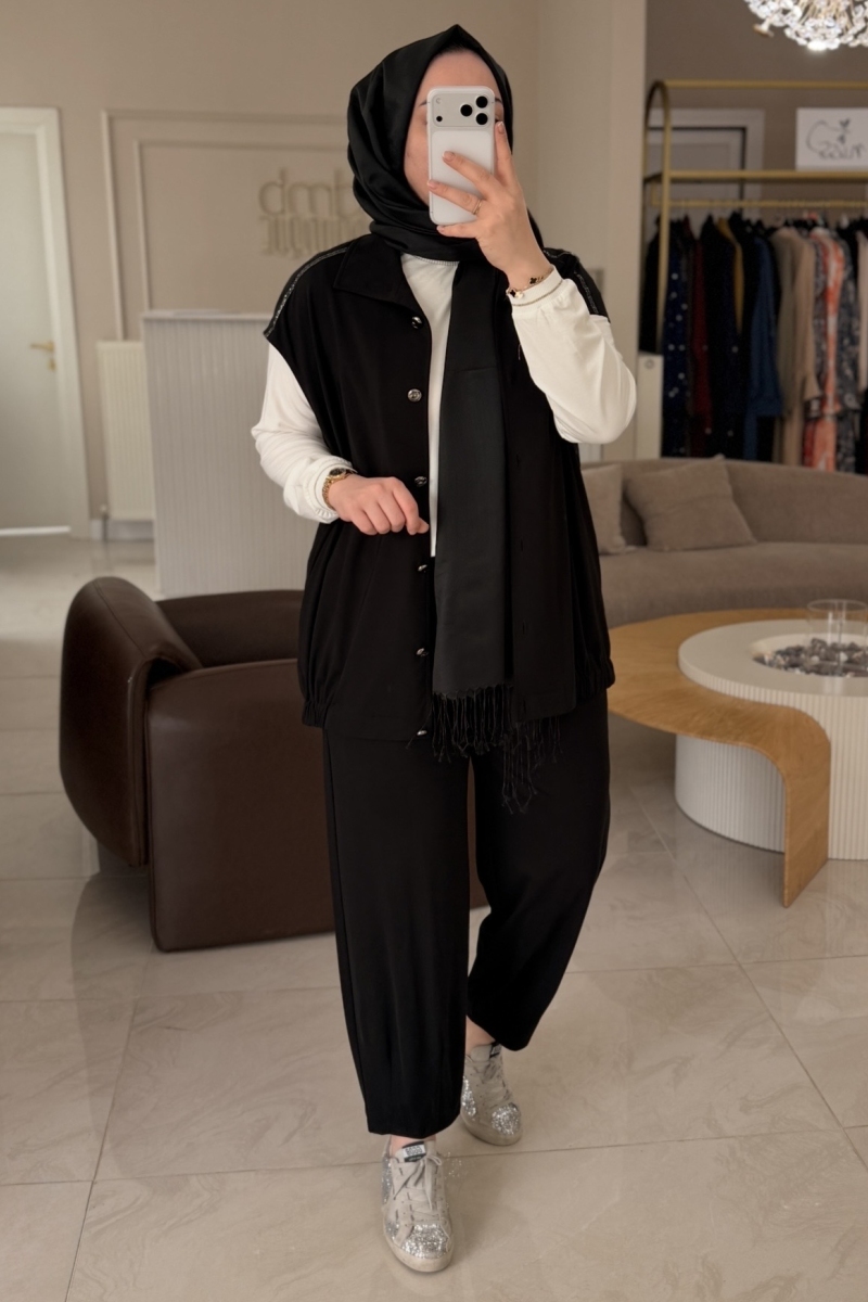 Tıg Trıko Siyah Pul Şerit Detaylı Yelek Paça Pensli Pantolon Takım 3106
