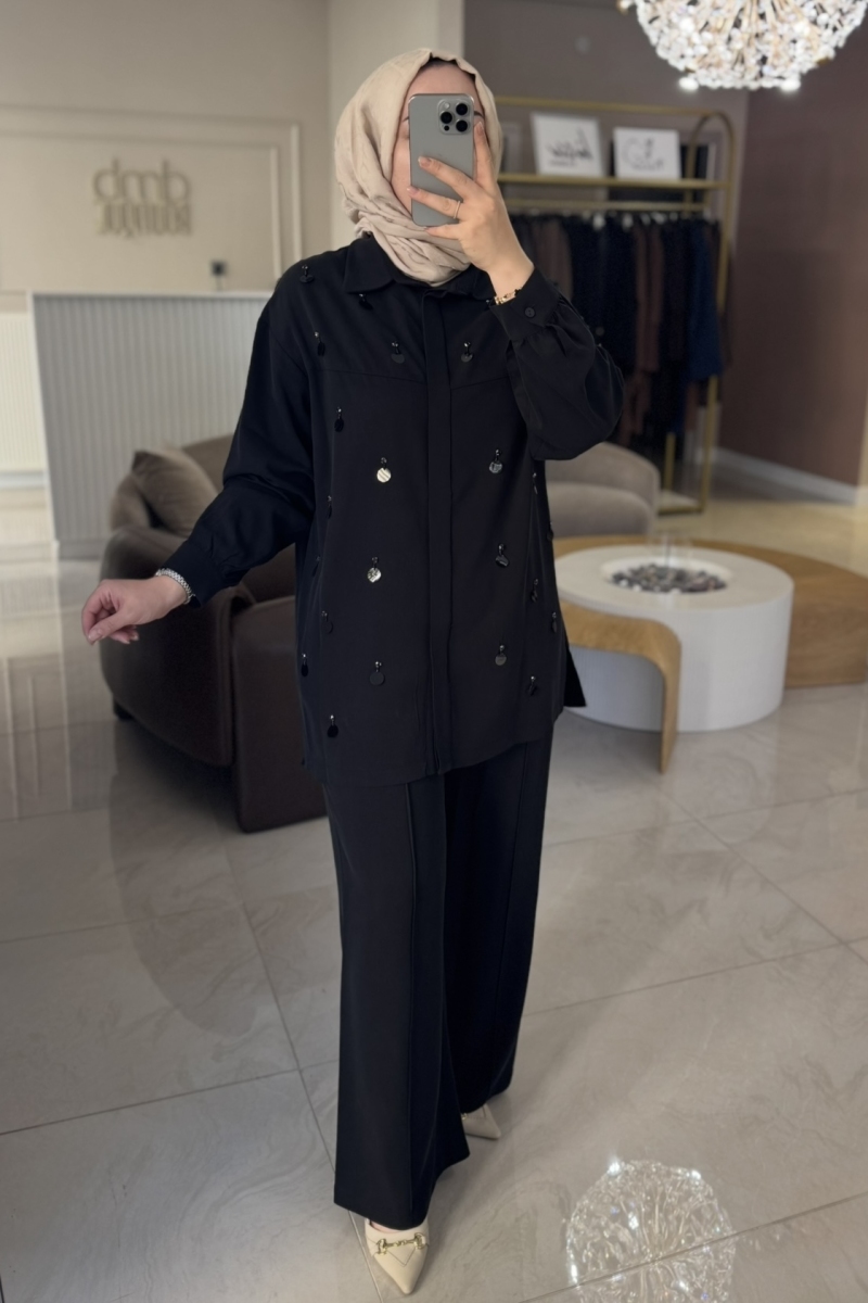Nuss Siyah Pullu Ve Taş İşlemeli Takım 1031