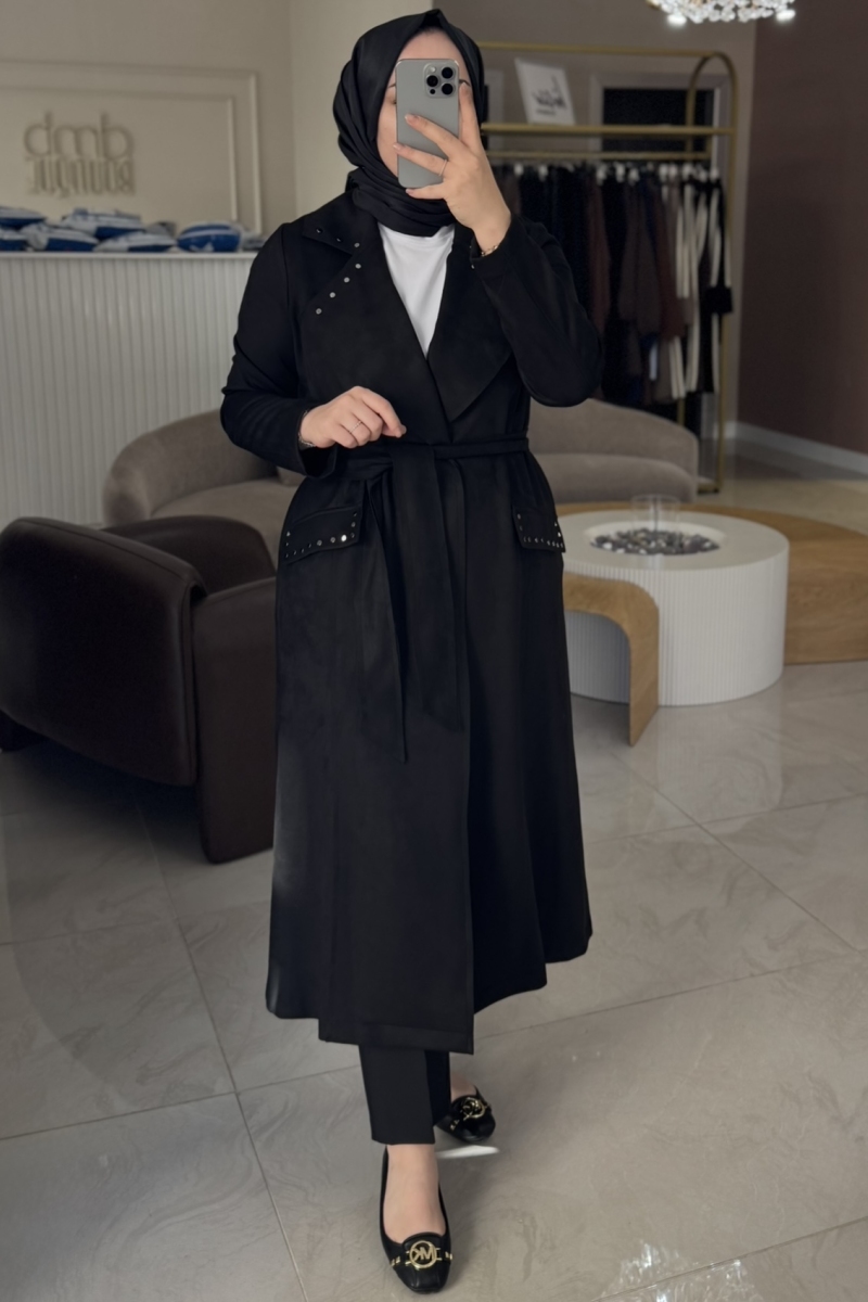 Siyah Süet Zımba Detay Bağcıklı Uzun Kap 6001