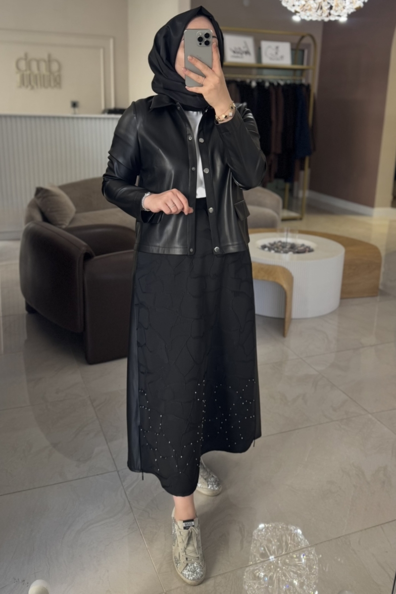 Esswaap Siyah Taş İşleme Etekli Deri Ceketli Takım