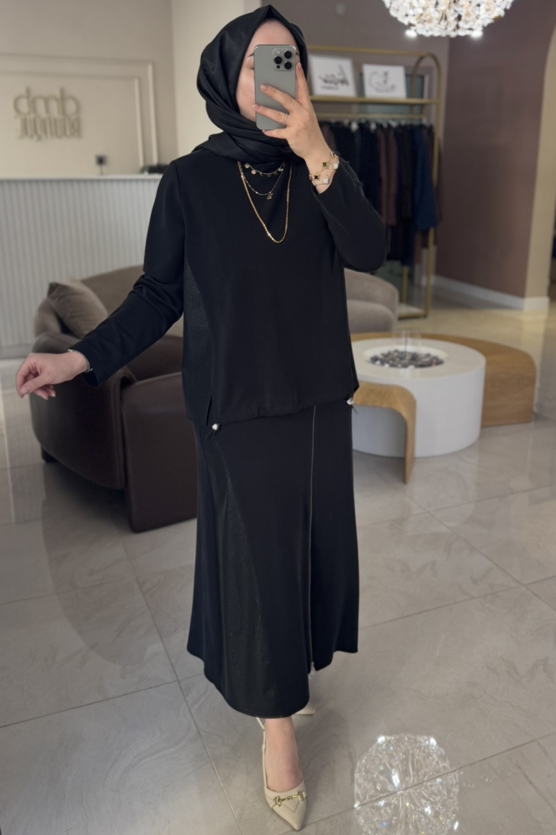 Esswaap Siyah Üst Büzgü Detay Fermuarlı Eteklı Takım