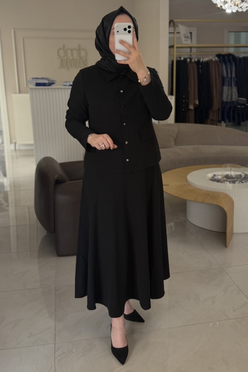 Siyah Yakası Taşlı Süet Etekli Şık Takım