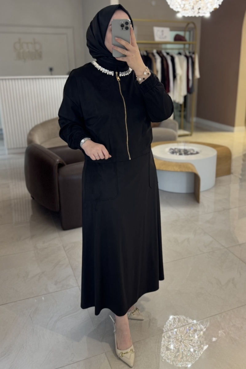Lısa Exclusıve Siyah Yakası Taşlı Süet Etekli Takım
