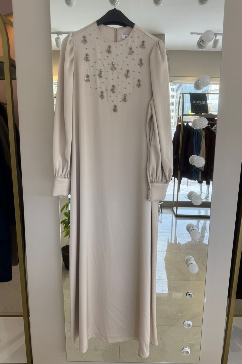 Yakası boncuk işleme detaylarıyla öne çıkan taş renk elbise, zarif ve şık tasarımıyla özel anlar için ideal bir görünüm sunar. Boncuk işlemeler elbiseye sofistike bir hava katarken, taş rengin doğal ve sade tonu şıklığı dengeler. Akıcı yapısı ve rahat kalıbı sayesinde hem estetik hem de konforlu bir kullanım sağlar. Davetlerden özel organizasyonlara kadar geniş bir kullanım alanına sahiptir.