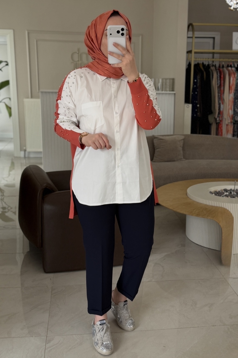 Tıg Trıko Turuncu Arkası Triko Taşlı Gömlek
