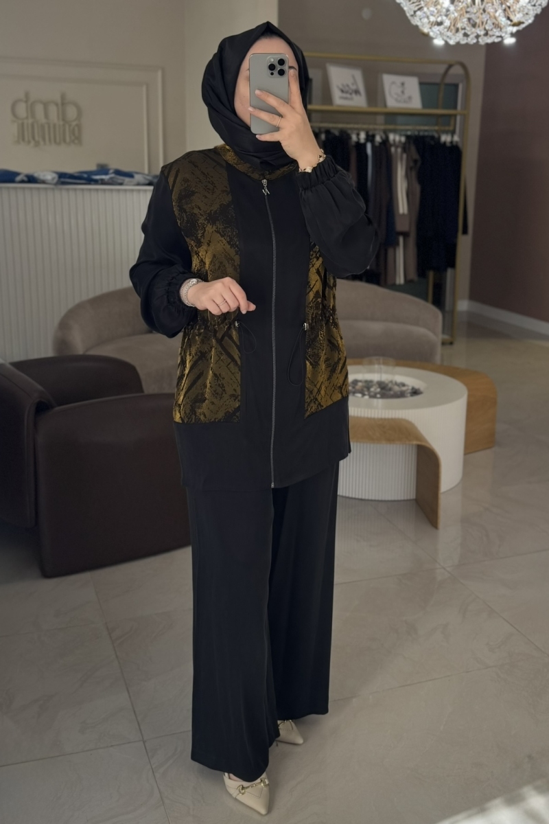 Siyah Pile Detaylı Pantolonlu İkili Takım