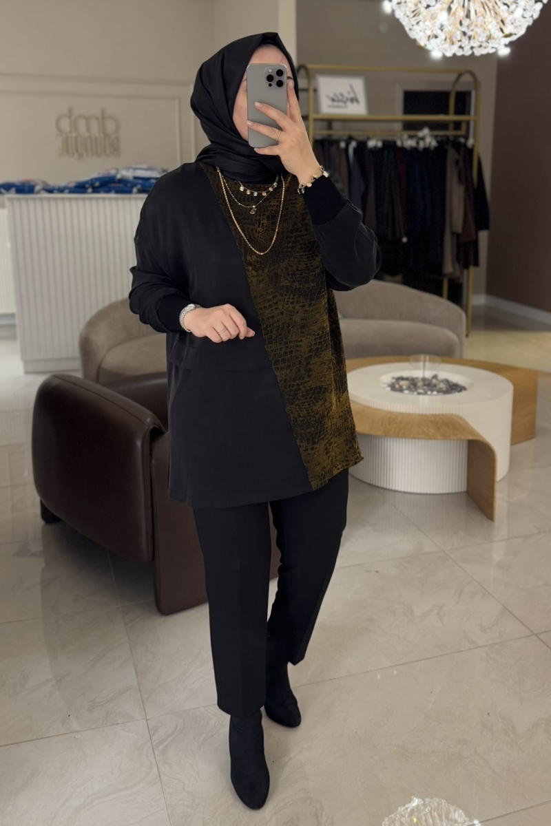 Siyah Süet Ve Merserize Detaylı 3004 Tunik