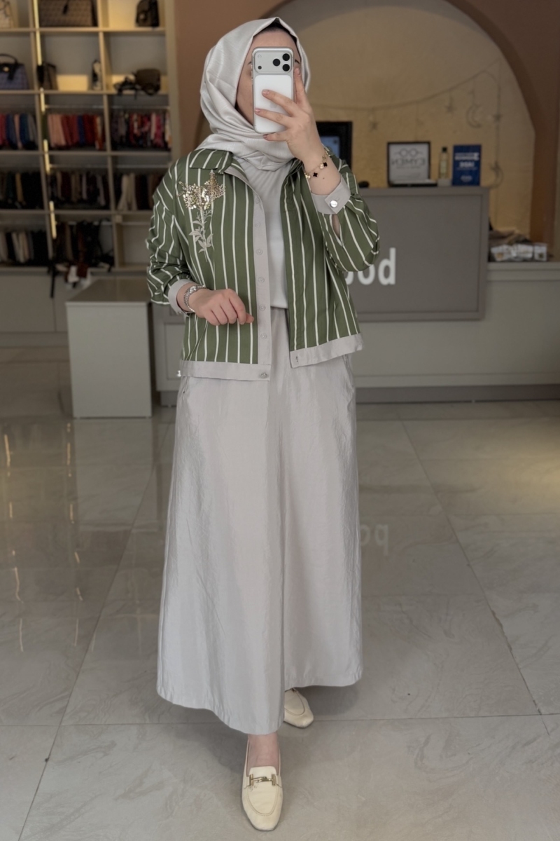 Tıg Trıko Yeşil Boncuk Pul Nakışlı Garnili Gömlek Ve Etek Takım
